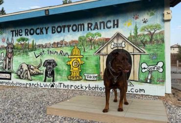 The ranch was originally called The Rock Bottom Ranch. When we lost our beloved Rocky, it seemed fitting to simply change the word Rock to Rocky and rebrand the ranch in his memory. 1000's of dogs will now visit and play in his honor. Keep an eye out and you may just see a memorial to this amazing dog we miss so much.